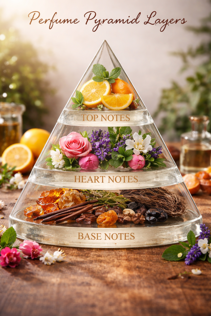 1. The Foundation: Understanding the Perfume Pyramid (Top, Middle, & Base Notes)