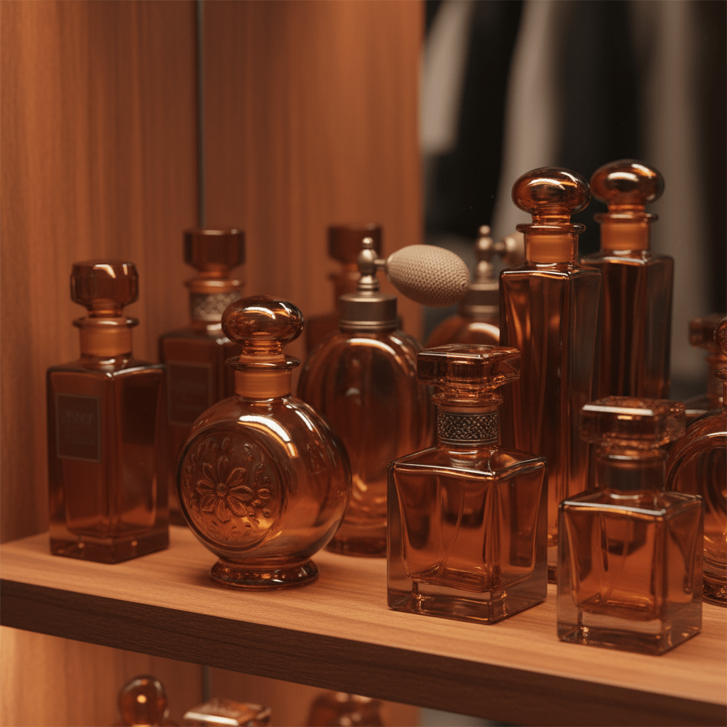 Amber perfume bottles on warehouse shelves representing white label inventory