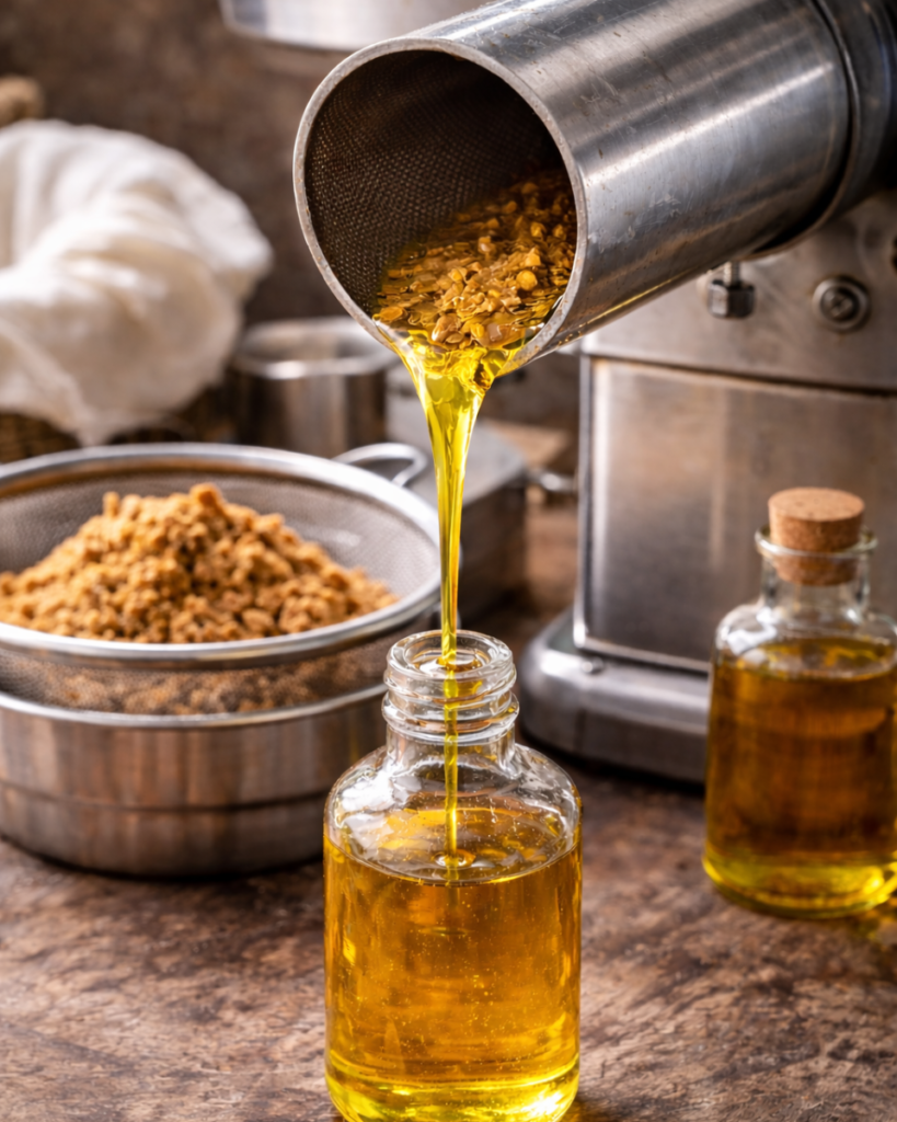 The cleaned jojoba seeds are mechanically pressed using a cold-press method without the application of external heat or chemical solvents. This gentle extraction process preserves the oil’s natural wax esters, nutrients, stability, and characteristic properties.